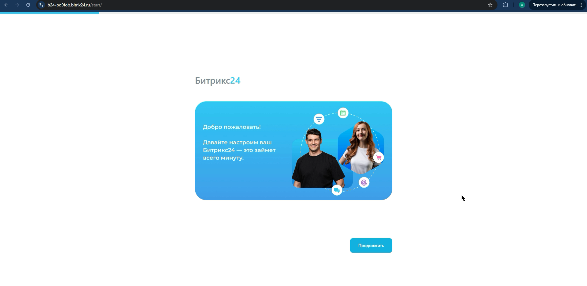 Пройдите шесть простых шагов создания рабочей среды. Вам будет предложено ответить на такие вопросы как: Сколько человек работает в вашей компании; В какой сфере работает ваша компания; Ваша роль в компании; Что вы хотите использовать в первую очередь. Если Вы пока затрудняетесь ответить на некоторые вопросы, то можете выбирать более приближенные к действительности ответы - они не повлияют на работу системы при тестировании.